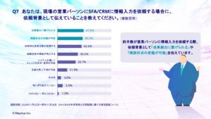 次世代型営業DXプラットフォームMazricaを開発・提供する株式会社マツリカ(本社:東京都中央区、代表取締役CEO:黒佐 英司)は、SFA/CRMを利用して営業活動を行っているBtoB企業・BtoBtoC企業の営業部門管理職及び主任等の営業担当者101名を対象に、SFA/CRMの利用実態と活用課題に関する実態調査を実施しましたので、お知らせいたします。