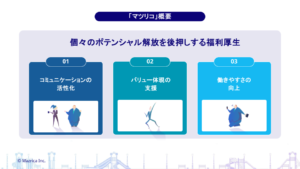 新しい福利厚生パッケージ「マツリコ」は、福利厚生をただラインナップするのではなく、マツリカらしいカルチャーが伝わるよう、目的や意義を明文化しました。利用することで「働きやすさの向上」はもちろん、「コミュニケーションの活性化」「バリュー体現の支援」といった視点からも社員の行動を後押しし、顧客への価値を提供します。