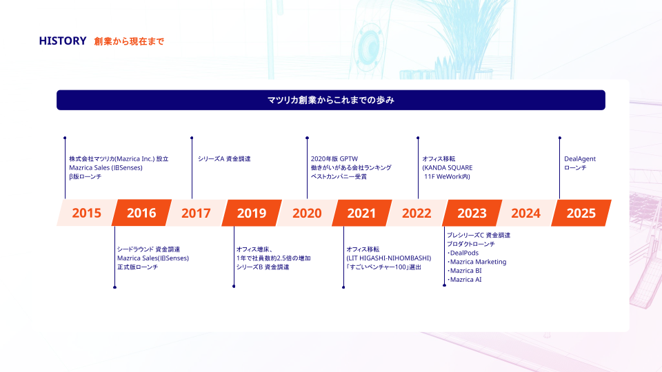 「創造性高く遊ぶように働ける環境を創る」をビジョンに掲げるマツリカは、人とテクノロジーの力を掛け合わせることで、もっと自由で、もっと創造的で、充実したワークライフをこの世の中に生み出していきます。現在は、属人化の解消が急務である営業現場のユーザーに向き合い、次世代型営業DXプラットフォーム「Mazrica」と、国内初のデジタルセールスルーム「DealPods」を開発・提供しています。