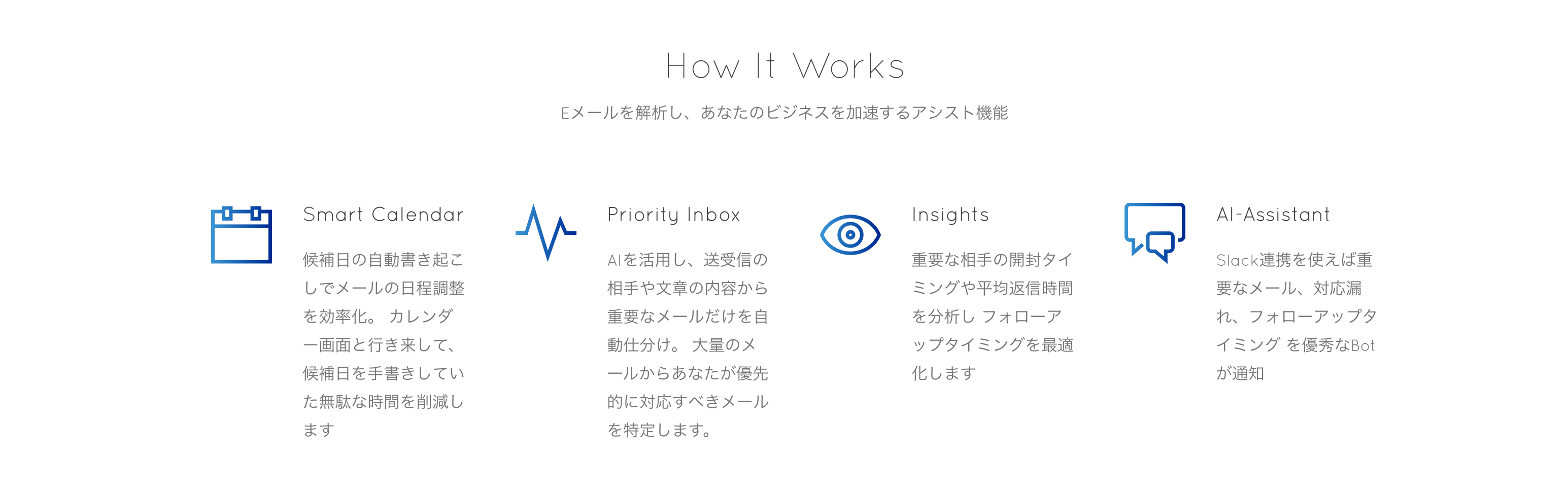 Notiaは外部とのやりとりでEメール利用がまだまだ多い営業パーソンに向け、返信対応漏れの防止や、フォローアップの支援、面倒な日程調整の自動化の機能の提供によって生産性の向上を目指しています。