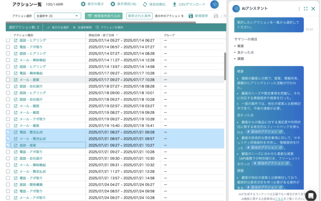 過去の類似したケースでのアクションを検索し、ヒットしたアクションでの成功要因や懸念をAIに抽出してもらうことで提案準備に活かす。