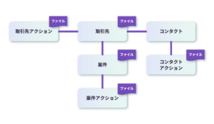 ・コンタクト…取引先の名刺情報。具体的には、氏名やメールアドレス、役職など。