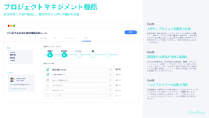 大型商談では長期にわたる営業活動が求められます。このような商談では、提案力やコミュニケーション能力だけでなく、プロジェクトマネジメント力も重要です。DealPodsを活用することで、顧客とのプロジェクト管理・タスク管理が容易になり、双方でネクストアクションを合意し、期日通りに成約に導くことができます。これにより、プロジェクトマネジメント型の営業活動の組織標準化が実現され、期日ズレ(スリップ)が組織的に減少します。
