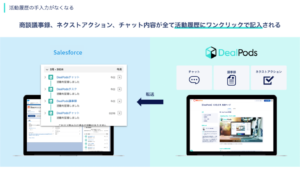 顧客に送付するためにDealPods内に格納した商談議事録、ネクストアクション、チャット内容の全てがワンクリックでSalesforceの活動履歴に自動連携されます。通常はメールやチャットで送った内容を抜粋し、活動履歴に再度記載する必要があったところが、顧客に送付した内容をそのまま抜粋してSalesforceを開くことなく活動履歴に入力することができるようになります。