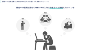 従来のCRM/SFAでは、営業が顧客に対して行ったコミュニケーション(メール・電話・オンライン商談・訪問記録)の内容を社内の管理のために営業活動とは別に入力する必要があり、これが二重記載や手間を生み出していました。その結果、営業が全ての活動をCRM/SFAに入力することができず、結果としてCRM/SFAにデータが貯まらないという問題を抱えている企業様も多く存在します。