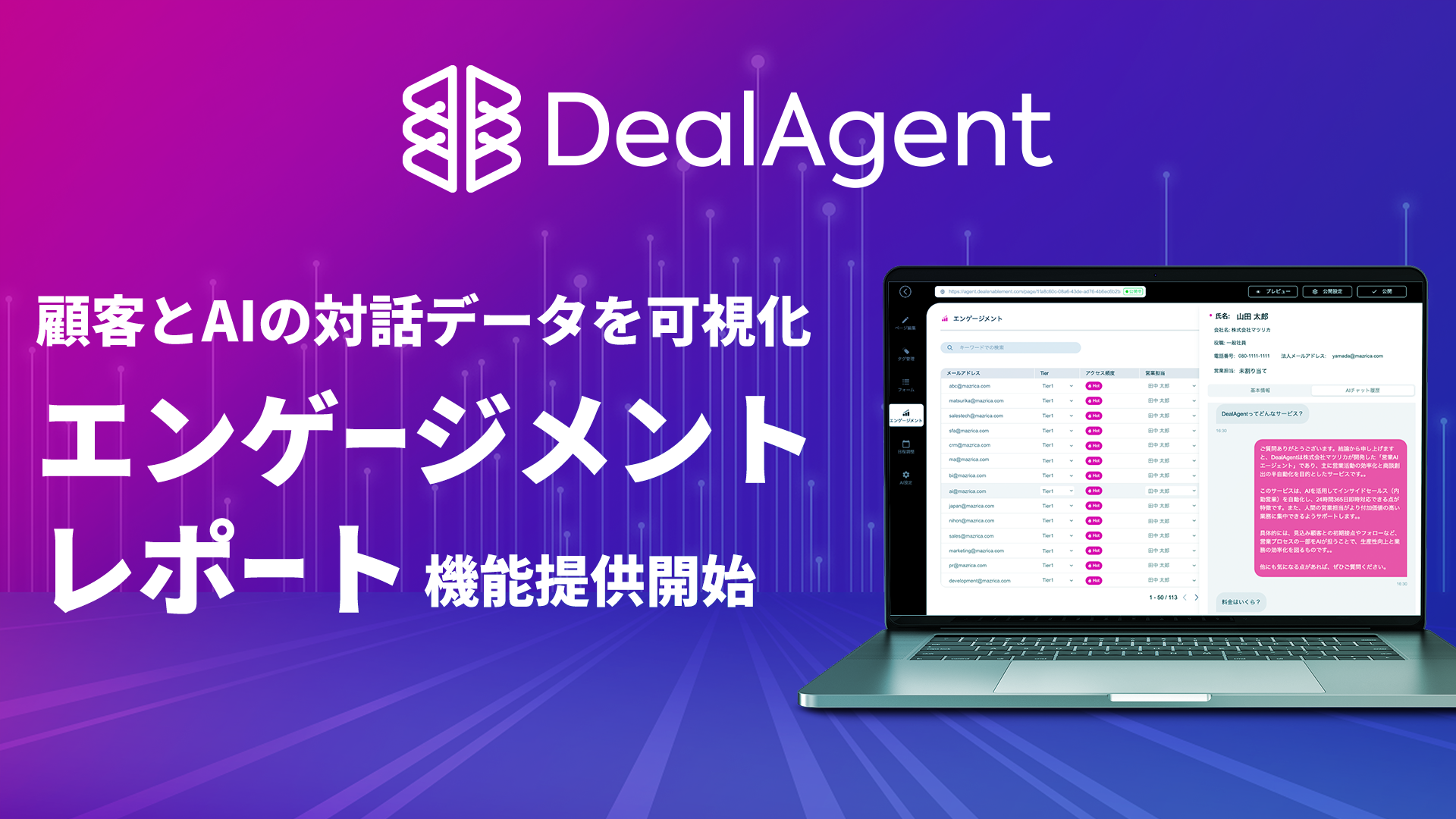 DealAgent、顧客とAIの対話データを可視化する「エンゲージメントレポート」機能を提供開始 —Web行動データに加えAIチャットを通じたゼロパーティデータを収集・分析—