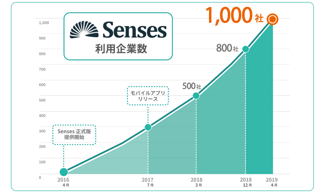 Sensesは「営業をもっと自由に、 もっと創造的に。 」をミッションとした営業支援ツールです。 営業パーソンをはじめとする現場のユーザー目線を大切にしながら、 日々サービス改善に努めています。 2016年4月の提供開始から約3年間で、 利用企業数は1,000社を突破いたしました。