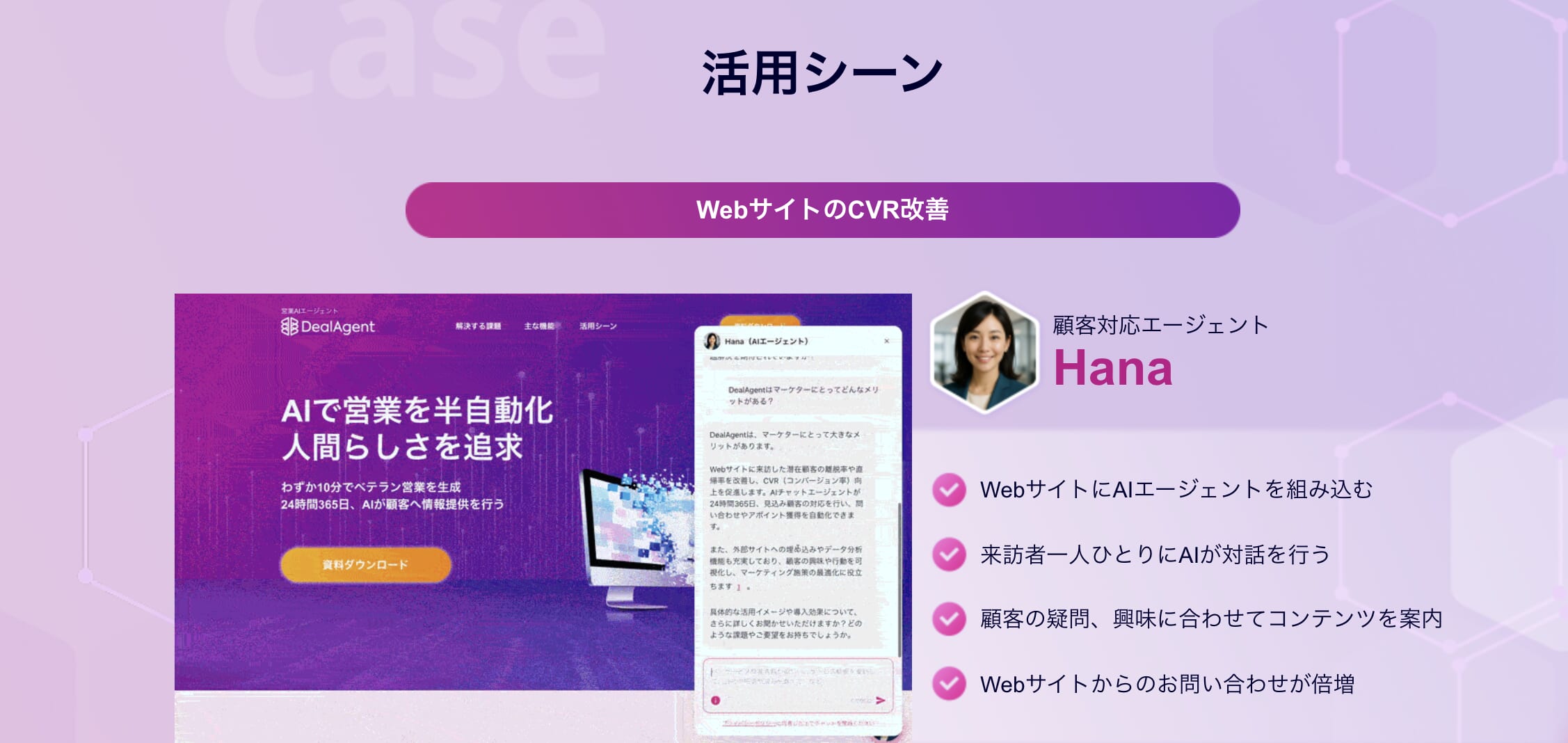 Hanaは、訪問者一人ひとりに対してパーソナライズされた対話を行い、「AIによる自動最適化」によってコンバージョンレート(CVR)を1.3倍〜1.5倍に改善します。