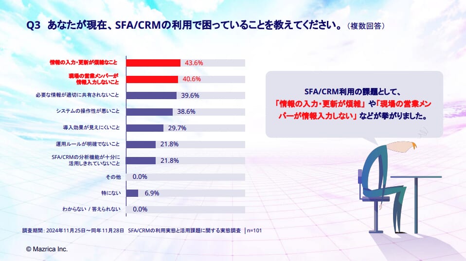SFA/CRMの利用課題として、43.6%の企業が「情報の入力・更新が複雑」 と回答し、40.6%の企業が「営業メンバーが情報を入力しない」 という課題を抱えていることがわかっています。
