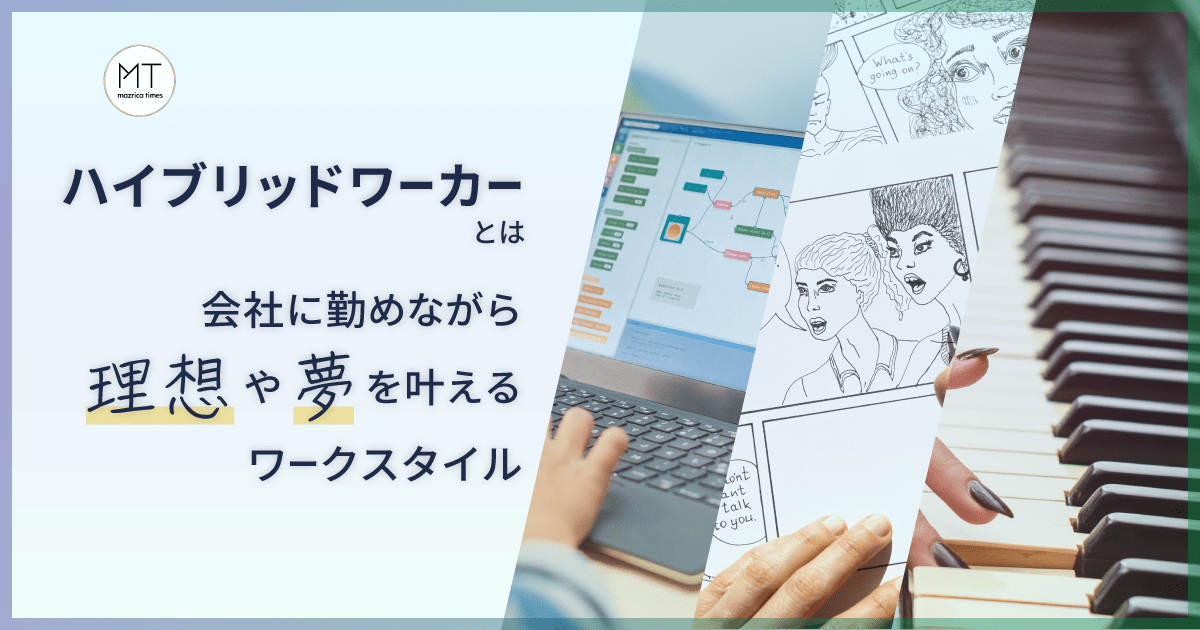 ハイブリッドワーカーとは、本業と副業をかけ合わせて働く方法です。平日は会社員として企業に勤めながら、仕事終わりや週末に副業を行います。副業の内容は、例えば音楽活動や漫画家など、本業では叶えられない仕事や自己実現のための活動になります。